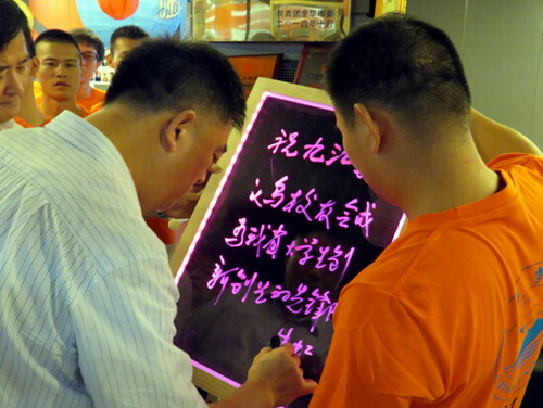 在视察刘鹏飞校友飞天麦光光公司位于义乌国际商品城的展示厅时,朱虹副省长饶有兴致地参观了公司生产的孔明灯、十字绣、数字油画等产品,对于这些产品远销海内外的业绩表示赞扬,并在校友最新研制的多用荧光板上欣然题词:“祝九江学院义乌校友会成为我省大学生创新创业的先锋队。”