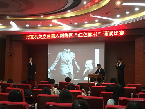 为迎接建党97周年,响应省委书记、省长刘奇同志向全省党员干部发出的“每位同志都要认真读一读红色家书”的号召,根据市委组织部和市直机关工委要求,市直机关各单位认真开展 “诵读红色家书”系列主题活动。6月15日下午,市直机关党建第六网络区在我校逸夫图书馆报告厅举行了“红色家书”诵读比赛。参加诵读活动的有市直机关工委领导、党建第六网络区参赛单位领导和职工代表160余人。