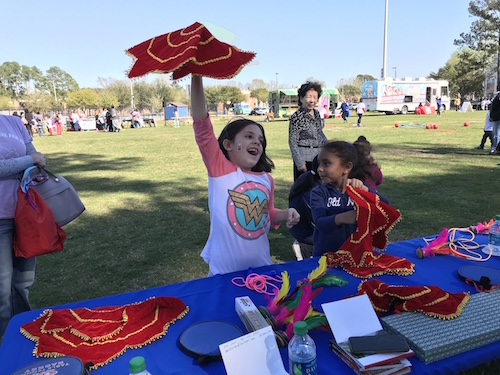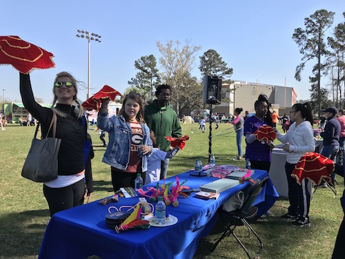 萨凡纳州立大学孔子学院在本次活动中设立展台,除了新奇的空竹、精美的手工风筝、鲜艳的秧歌手帕、五彩的鸡毛毽子,以及大家并不陌生的兵乓球、跳绳等运动器具外,孔院教师们还准备了有趣的中国民间故事系列绘本、孔子学院历年活动简报以及孔院的宣传册。