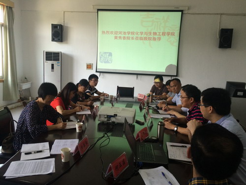 严平院长首先代表化环学院热烈欢迎河池学院同仁来院考察交流,并详细介绍了学校、学院的基本情况和运行管理模式,杨期勇副院长就学院环境类专业发展过程进行了介绍,曹小华副院长采用PPT的形式图文并茂的介绍了学院在人才培养等方面的办学特色,工程中心彭游副主任介绍了学院科研团队建设情况。随后,双方就应用化学、环境工程专业在人才培养方案、转型发展、校地(校企)合作、实验室建设、教学科研团队建设等方面进行了深入的交流和探讨。