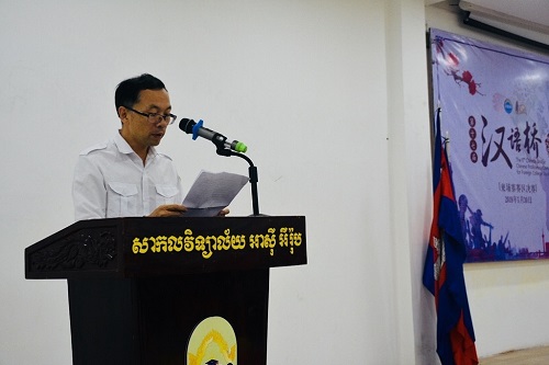 孙色塔副校长在开幕式上致辞,他感谢柬埔寨皇家科学院孔子学院在亚欧大学开设中文系,为柬埔寨培养了一大批汉语专业人才。中文系的汉语比赛活动丰富多样,特别是“汉语桥”,给了学生展现自己中文水平的机会,每一次比赛都能增长学生的知识和经验。他希望大家学好中文,为中柬之间的合作搭建桥梁。