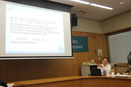 桑龙扬教授作为国学译馆负责人和“庐山文化传承与传播协同创新中心”编外研究员,在研讨会上宣读了题为“儒学经典外译的新模式探索-- 《论语》和《孟子》的‘公理化’诠释与翻译实践”的论文。李宁宁教授回答了与会专家的相关提问。与会专家对九江学院开展的国学经典公理化诠释与翻译工作给与了高度评价,认为这是在“中国文化走出去”的背景下,中华文化典籍外译的创新模式,方法独特,视角新颖,而且成果丰富,具有鲜明的特色,可以称为“九江学派”。