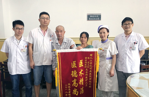 在重症医学科度过危险期,患者转入神经外科普通病房继续治疗,经过康复训练、针灸、高压氧等治疗,患者很快可以搀扶行走,生活能自理,无明显并发症。患者及家属非常满意,特意制作了一面书有“医术精湛,医德高尚”的锦旗送到病区,向医护人员表达了他们满心的感激之情。
