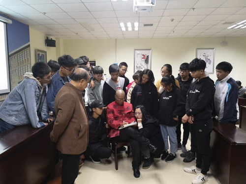 讲座最后,吴老师组织同学进行现场实践教学,并给参与的同学赠送了书法作品,吴老师鼓励同学们要发扬持之以恒和水滴石穿的求学精神,在艺术的道路上不断求索,更上一层楼。