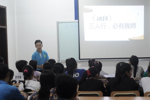 孔子学院本部、亚欧大学中文系、暹粒吴哥高中孔子课堂和棉芷大学中文系教师们则对《论语》和《诗经》进行了细致地讲解。孔子学院本部开展了“体验孔子课堂”论语诵读和“走近孔子,走近《论语》”文化讲座。