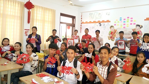 柬埔寨皇家科学院孔子学院韩桑林大学汉语中心举办“写福字 剪窗花 庆新年”活动