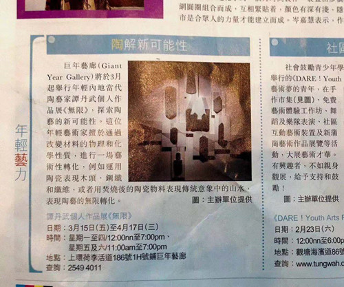 2019年3月15日,青年艺术家、九江学院艺术学院教师谭丹武个人作品展《无限》(展期:2019年3月15日至4月17日)在香港巨年艺廊(Giant Year Gallery)隆重开幕,来自香港本地和台湾的著名陶艺家赵素兰、关秀文、陈兰美等以及国内外藏家出席了开幕式。巨年艺廊是香港唯一专注推广本地及国际当代陶瓷艺术的艺廊,谭丹武是内地第一位受该艺廊特邀做陶艺个展的青年艺术家。