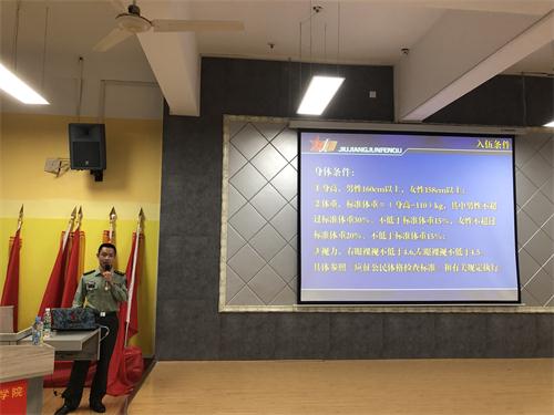 会上,钟韬从2019年国家征兵政策,省、市对高校征兵工作的政策层面进行了深入地解读,重点针对大学生入伍的优惠政策、参军后职业发展规划以及退伍后的各项保障措施等进行了辅导。学校学生资助管理中心罗中炜老师就大学生入伍学费补偿代偿等相关工作做了详细说明。
