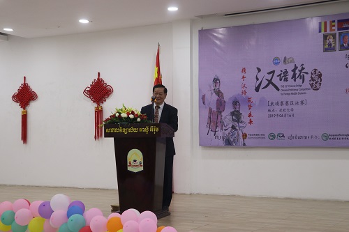 柬华理事总会副会长兼文教师资基金处处长郑棉发勋爵在开幕式上致辞,他说:“汉语桥激发了学生学习汉语的热情,是走近中国、了解中国的窗口。柬华理事会一直很重视柬埔寨的华文教育,培养学生对中华文化的兴趣和汉语交流能力。”