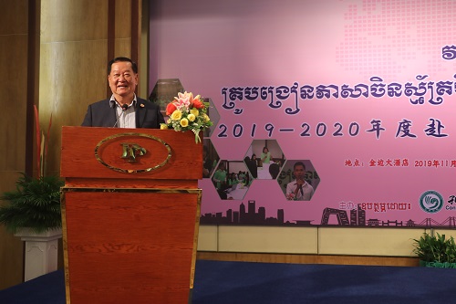 11日上午,2019-2020年度赴柬汉语教师志愿者岗中培训在柬埔寨金边大酒店顺利开幕。柬埔寨皇家科学院秘书长杨博(YANG Peou)博士、孔子学院总部/国家汉办项目官员来永梅女士、柬埔寨柬华理事总会常务副会长兼文教处长郑棉发勋爵、柬埔寨柬华理事总会常务副会长兼文教副处长蔡伟华先生、柬埔寨柬华理事总会常务理事陈中盛先生、吴朝文先生、孙宝儿先生、曾广荣先生、柬埔寨柬华理事总会常务秘书钟耀辉先生、柬埔寨皇家科学院孔子学院柬方院长苏碧娜女士(VUTH Sopheakna)、中方院长柴克清先生、首都师范大学国教学院林秀琴副院长、柬埔寨皇家大学DHY汉语中心主任周丽云先生、志愿者管理教师田金金女士、李玉立先生等领导莅临本次开幕式。苏碧娜院长、郑棉发勋爵以及来永梅女士致辞,希望志愿者们“展现青春风采,让‘汉语之花’在柬埔寨继续美丽绽放”。全柬253名汉语教师志愿者和16名公派教师参加了本次开幕式。