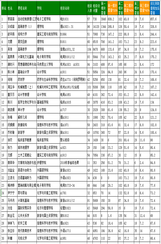 此次比赛从9月底启动到12月底结束,为期3个月,每月末,教务处会根据超星后台提取的各参赛教师对于学习通资源及各控件使用情况的原始数据,按照课前、课中、课后三个模块各取一定比例进行星值汇总并排名,现将10月份排名前30的教师名单公布如下: