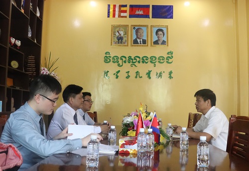 10月19日上午,华南师范大学东南亚研究中心执行主任柯森、特聘研究员高皇伟以及研究员刘晗等一行人来访柬埔寨皇家科学院孔子学院。柬埔寨皇家科学院孔子学院中方院长柴克清在芳华楼会议室热情接待来宾,双方就华文教育在柬现状进行了详细的探讨。