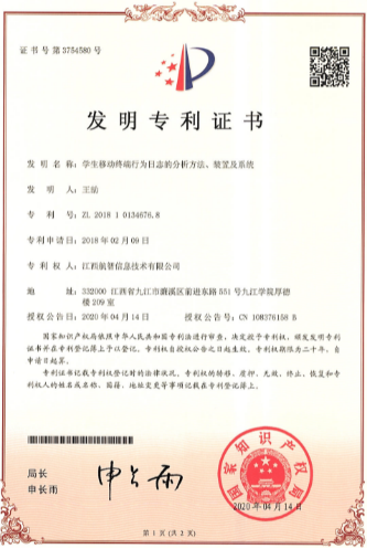 江西航智信息技术有限公司是我校大学科技园2019年6月引进的专注于K12教育信息化的互联网科技型企业。公司十分注重自主知识产权培育和创造,现已申报国家发明专利9项,目前授权1项,发明名称为:学生移动终端行为日志的分析方法、装置及系统;同时申报软件著作权15项,获得了授权10项。