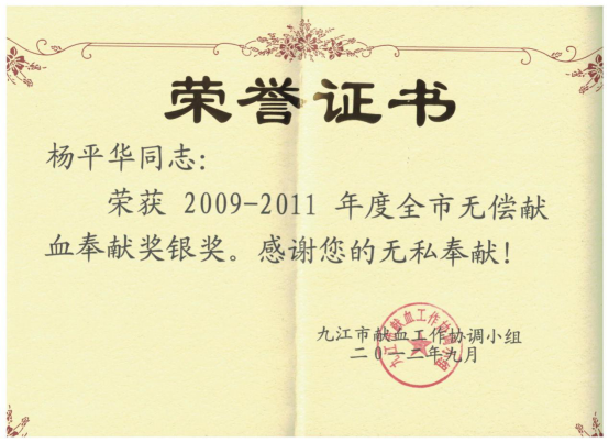 无偿献血奉献奖银奖证书