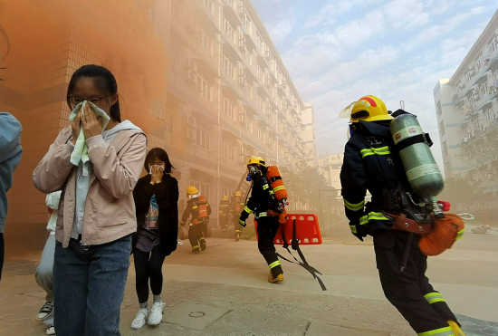 紧接着,消防车辆到达火灾现场,消防队员、老师与学生干部组织同学们有序疏散,他们利用预先准备好的湿毛巾捂住口鼻,低姿弯腰从着火楼栋有序撤离到安全地带。同时,消防队员则利用9米拉梯在2楼起火房间救援“被困同学”,使用求生气垫将该同学营救至安全地带。待命在室外一楼地面佩戴空气呼吸器的两名消防战士将伤员担架抬至安全地点。
