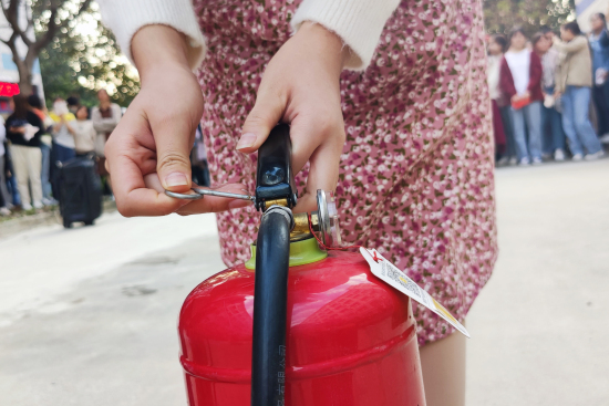 逃生演练结束后,现场师生还对如何正确使用灭火器的方法进行了学习。保卫处工作人员强调使用四字要领“提”“拔”“握”“压”,并用谐音“提拔我呀”方便同学们记忆。现场气氛十分活跃,宿管员、辅导员和同学们一起踊跃参与灭火器的实践操作。文传A2031班夏玲英同学说:“非常感谢学校能够组织此次演练。我是第一次使用灭火器,一开始一头雾水,但在心里默念了刘老师教的四字口诀,突然发现原来灭火器的正确使用很简单。”