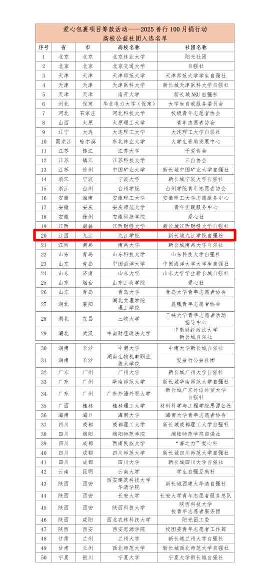 近日,从中国乡村发展基金会传来喜讯,我校成功入选2025年“善行100·月捐行动”公益项目,成为全国50所承办高校之一。这是我校公益实践工作的一次重要突破,也是对全校师生热心公益、持续奉献的充分肯定。