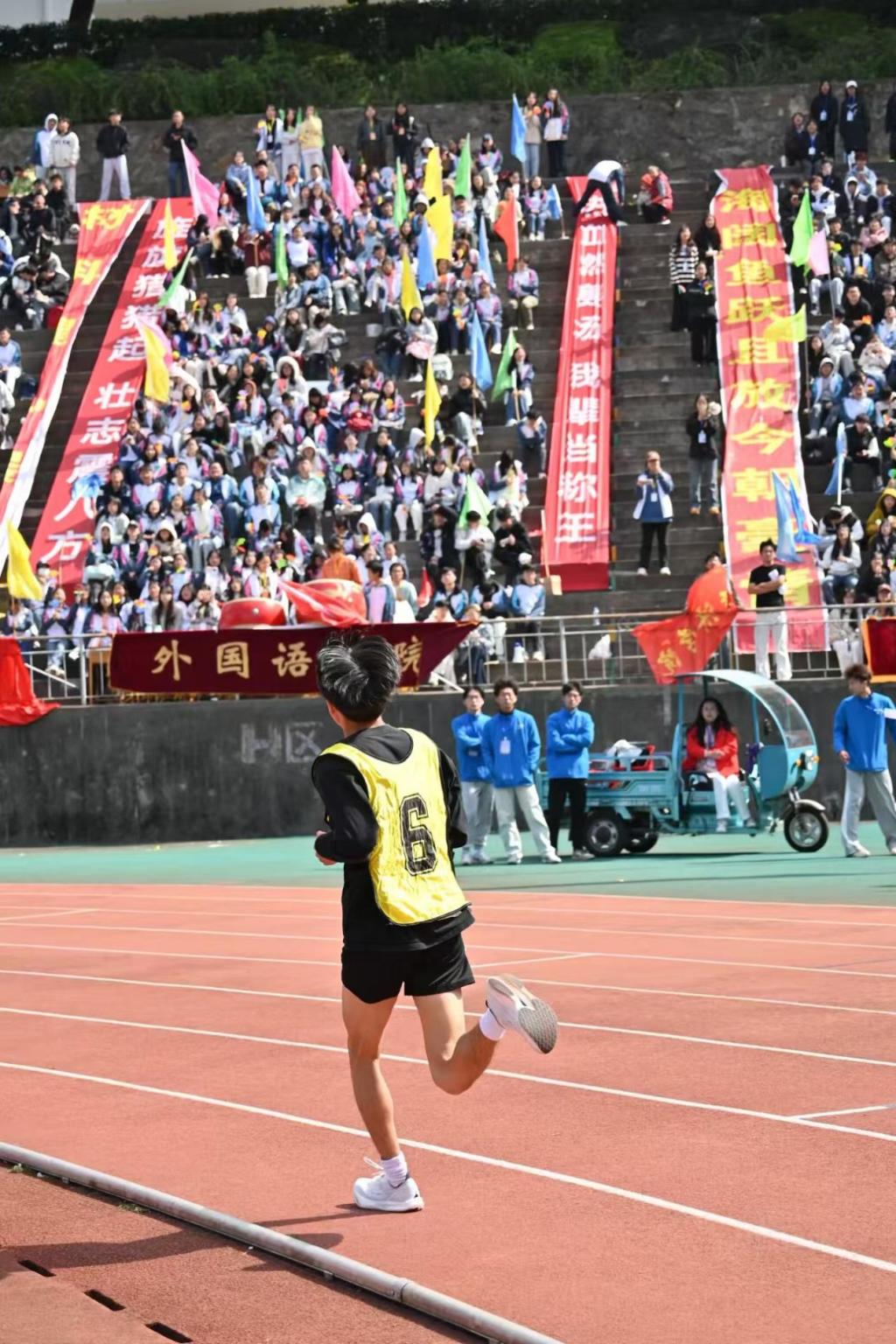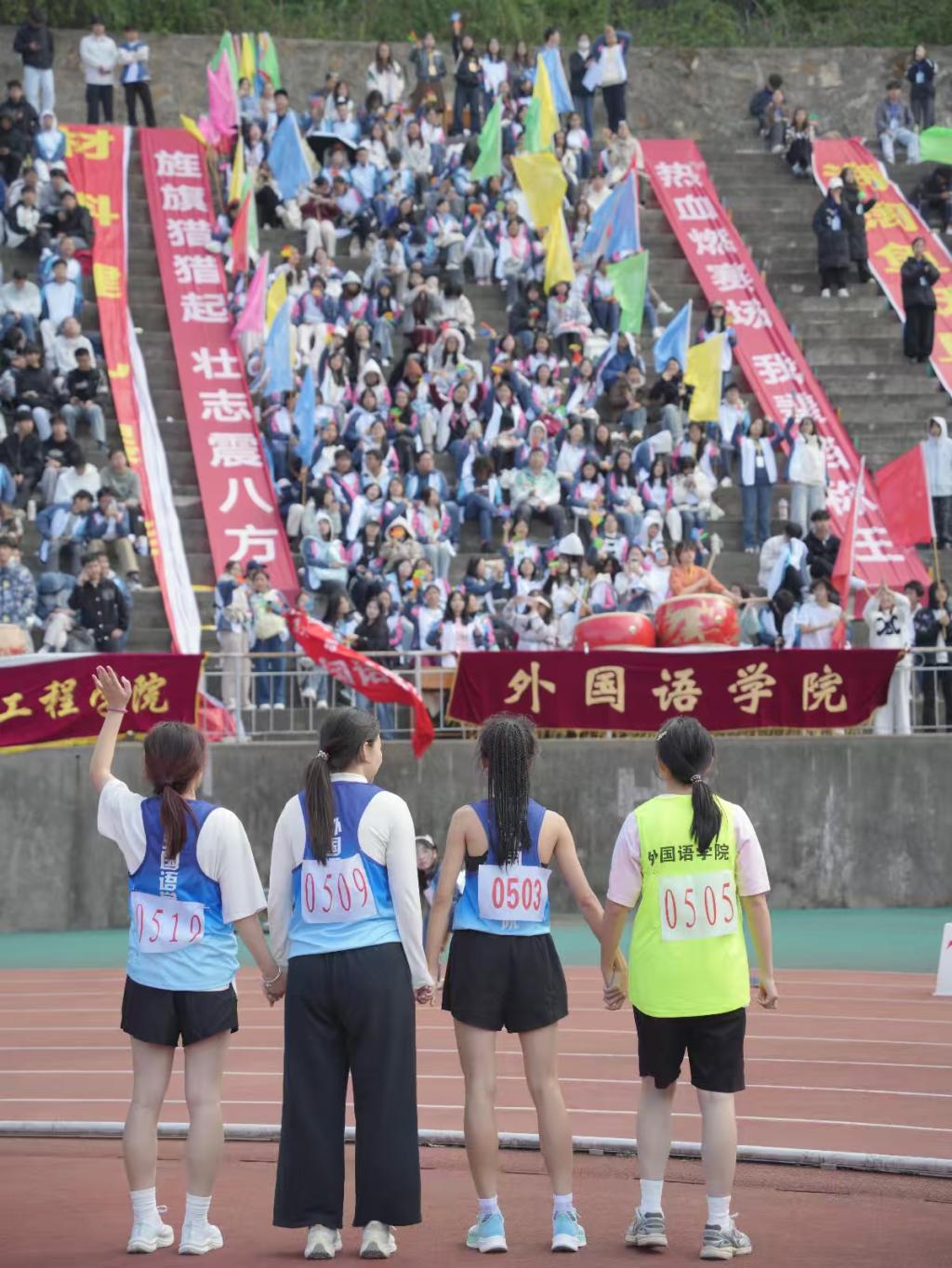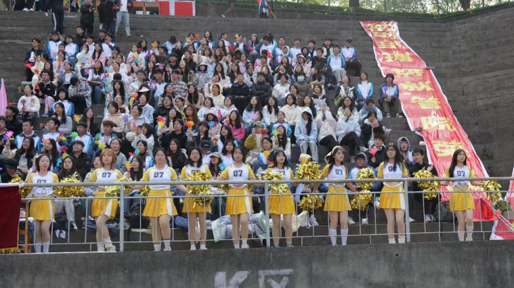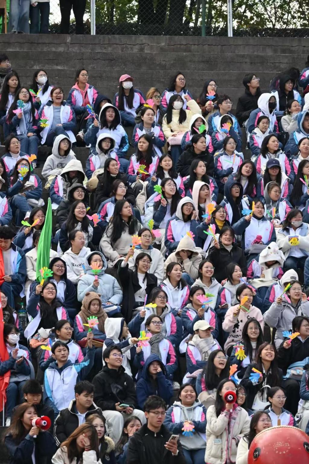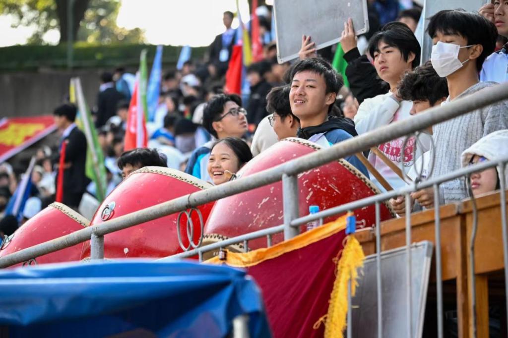 “加油!”“坚持住!”看台上,呐喊声此起彼伏;锣鼓声阵阵,点燃全场热情。各学院拉起定制横幅,啦啦队挥舞院旗,同学们踮脚眺望赛道,纵使秋风习习,也吹不散大家的观赛热情。