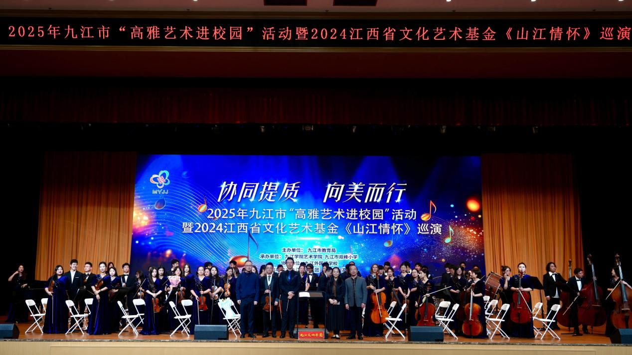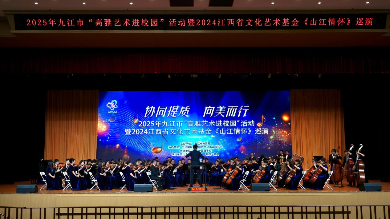 10月23日下午,由九江市教育局主办、艺术学院、九江市双峰小学承办,九江交响乐团出演的九江交响乐团2025年高雅艺术进校园暨江西省文化艺术基金《山江情怀》巡演第四场专场音乐会在九江市外国语学校成功举行。校党委委员、副校长查振华,市教育局党委书记、局长陈琪,市教育局党委委员、副局长曹利平,我校艺术学院、九江市外国语学校负责人等到现场与全场师生一同观看演出。