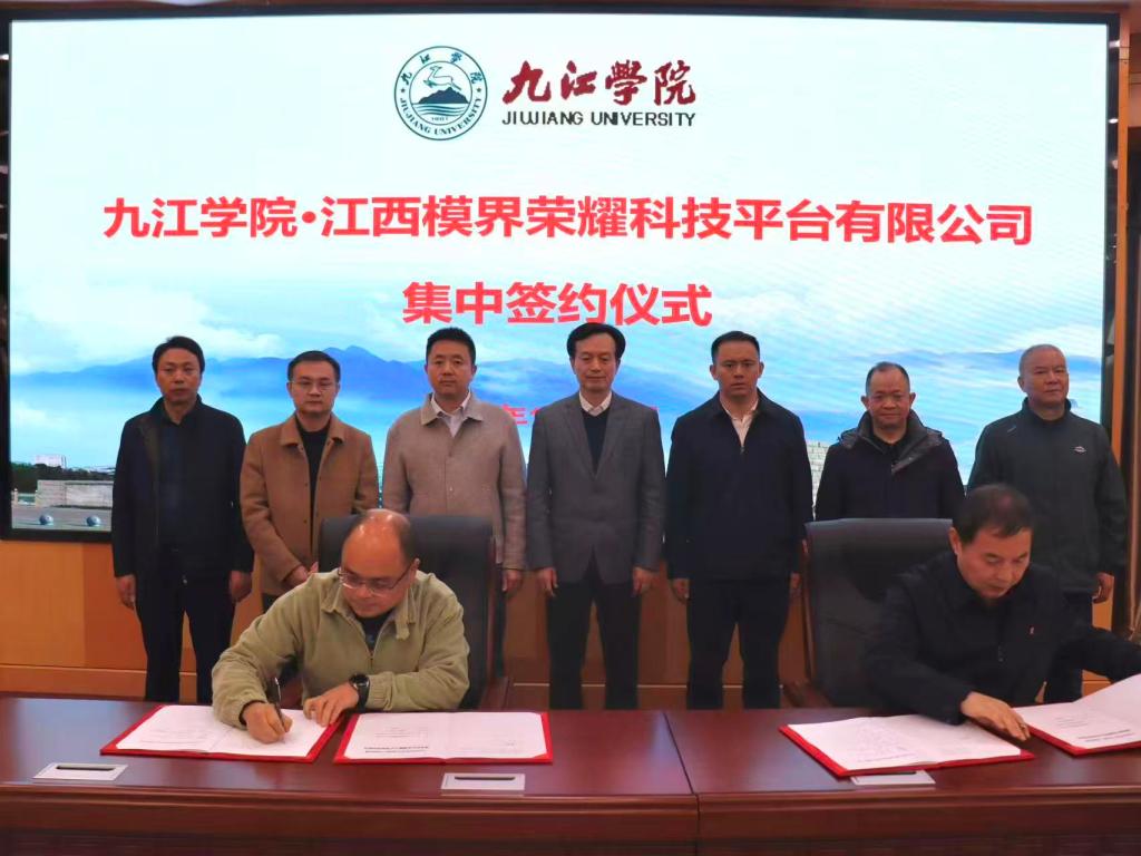 为深入贯彻省委“三大高地、五大战略”和九江市“三大攻坚行动”部署要求,落实学校“3353战略”与“十百千”社会服务体系建设,12月12日上午,九江学院与江西模界荣耀科技平台有限公司集中签约仪式在学校行政楼四号会议室举行。九江学院党委委员、副校长吴维勇出席签约仪式,江西模界荣耀科技平台有限公司总裁刘晓龙、总经理吴志成,修水县产业服务中心主任周正根,学校科研处、发规处、机械与智能制造学院、材料科学与工程学院、计算机与大数据学院、电子工程学院负责人及师生代表参加活动。
